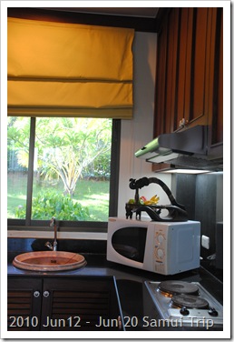 有個小小的冰箱,微波爐,烤麵包機,洗水槽,