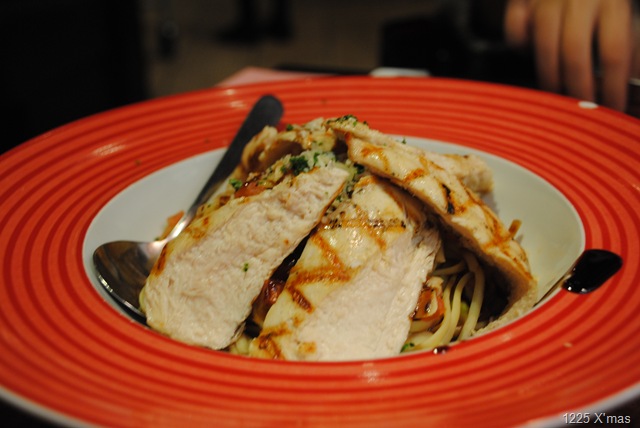 小份的三式組合開胃菜及一份蕃茄燻雞義大利麵,